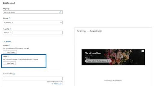 To add your company’s brand logo to your Multimedia Ads, you can now quickly do that in Microsoft Advertising online. To get started, you can upload up to five square (1:1) logo images and five landscape (4:1) logo images.